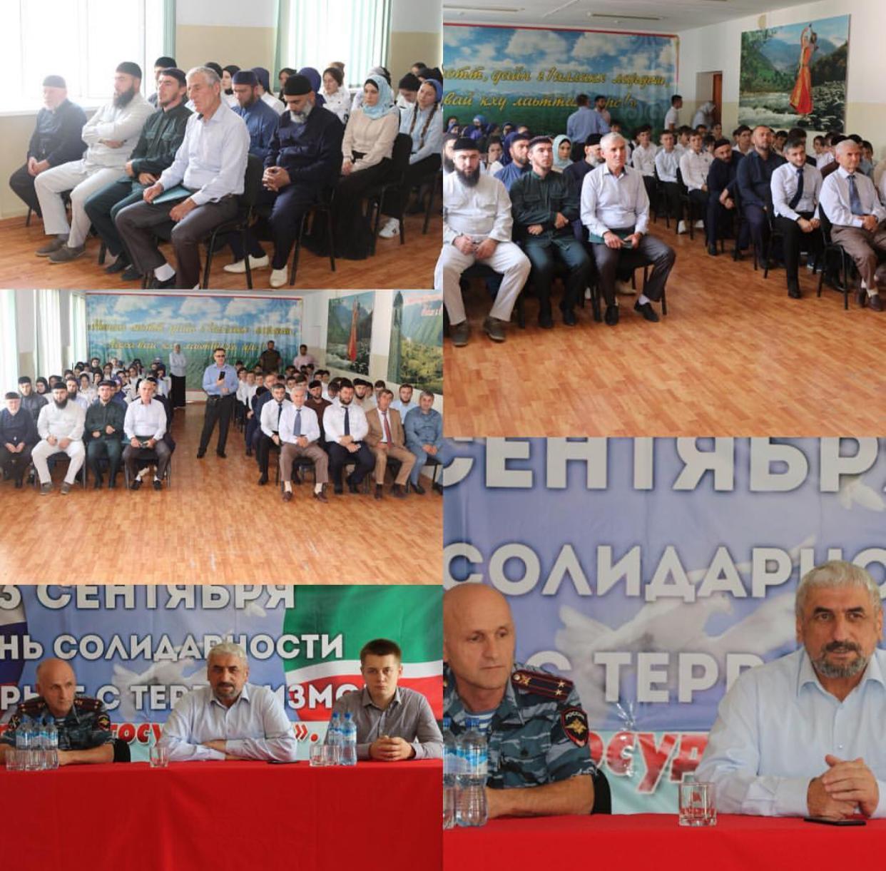 05.09.2018Время проведения: 03-04.09.2018 г. Цель : развить в школьниках сострадание и соучастие к жертвам терроризма; вызвать отрицание терроризма как явления ; научить осознавать важность извлечения уроков истории для собственного и национального будущего . В МБОУ «СОШ с. Шатой » с 3 по 4 сентября 2018 г. прошли мероприятия , посвящённые Дню Солидарности в борьбе против терроризма. 03. 09. в актовом зале школы прошла встреча учащихся 9-11 классов с главой администрации Шатойского муниципального района Чабагаевым Ш.Ш., подполковником внутренней службы МВД РФ ,начальником штаба ОМВД по Шатойскому району Джамалдиновым А-С.А., зам. начальника ФСБ ,оперуполномоченный отдела УФСБ по Шатойскому району Шабалиным П.В.. В своей речи Шадид Шахидович сказал, что духовно-нравственное воспитание подрастающего поколения призвано обеспечить возрождение и развитие на новом уровне национальных, религиозных традиций чеченского народа, начиная от почтения к родителям и уважения к старшим и заканчивая осознанием высочайшей от
