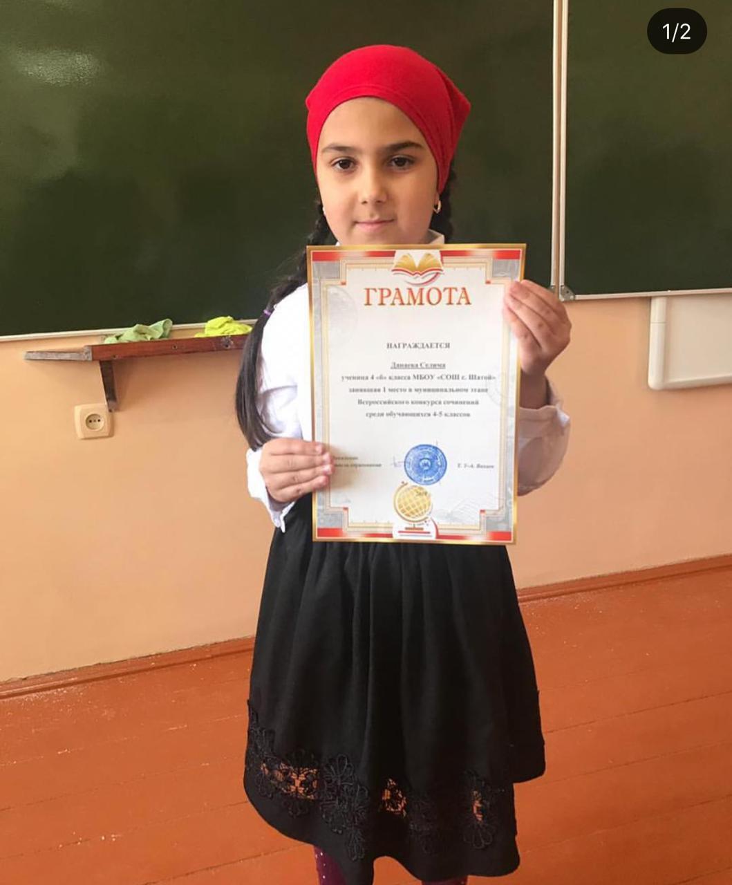 Ученица 4 «Б» класса МБОУ «СОШ с. Шатой» Данаева Селима заняла 1 место в муниципальном этапе Всероссийского конкурса сочинений среди обучающихся 4-5 классов.
